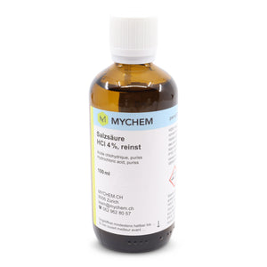 Acide chlorhydrique 4% 100 ml puriss: verre brunFlacon avec fermeture inviolable, sécurité enfants, symbole d'avertissement tactile et compte-gouttes.
