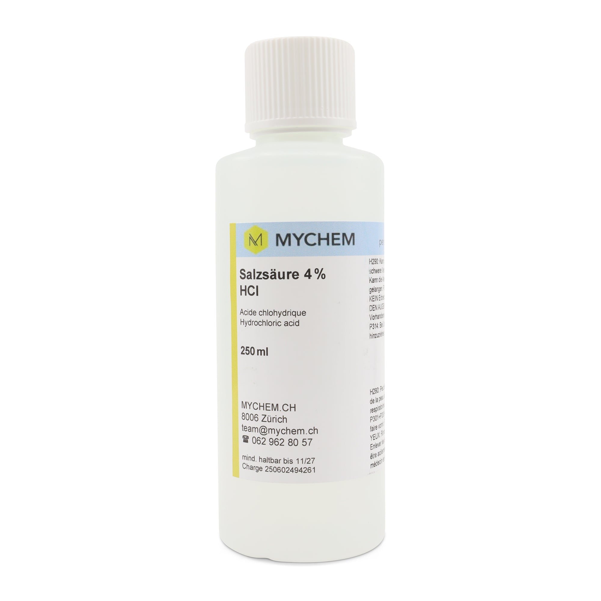 Acide chlorhydrique 4% 250 ml puriss: HDPE-Flacon avec fermeture inviolable, sécurité enfants et symbole d'avertissement tactile. ! pas de compte-gouttes !
