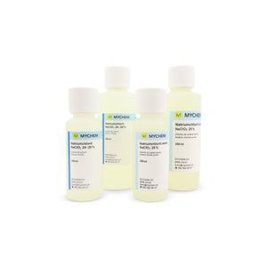Tropfen Sie Natriumchlorit (NaClO₂) und Salzsäure (HCl) im Verhältnis 1:1 in ein sauberes, trockenes Gefäss (kein Metall). Hierfür eignet sich der Tropfeinsatz von unseren 100ml Fläschchen. Alternativ können Sie unsere Pasteur-Pipette verwenden (nach Gebrauch jeder Chemikalie gut mit Wasser spülen).