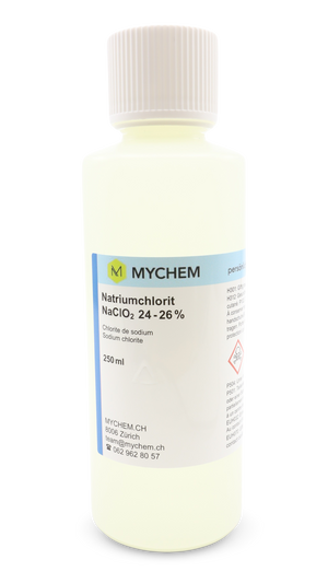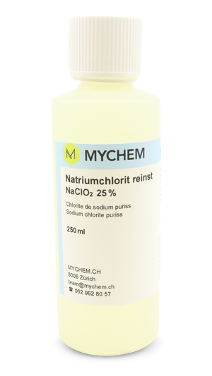 Natriumchlorit 25% 250 ml reinst: HDPE-Flasche mit Originalitätsverschluss, Kindersicherung und tastbarem Warnsymbol. ! kein Tropfenzähler !